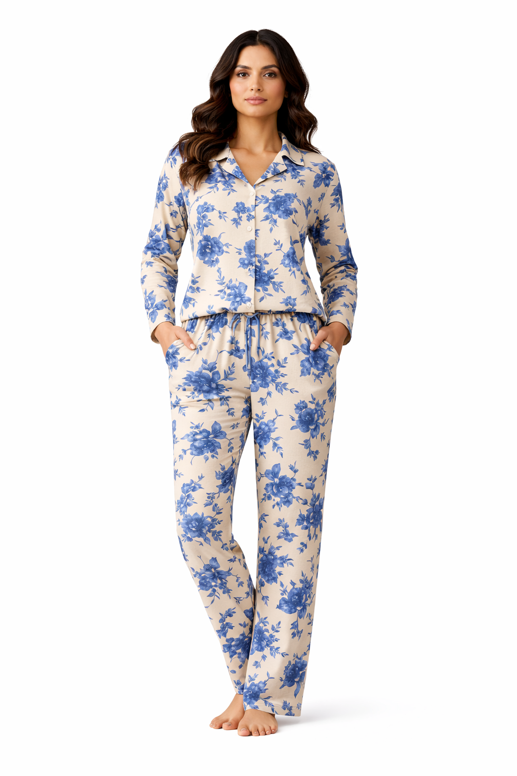 The relaxed-fit button-down shirt paired with straight-cut pants offers a perfect balance of style and comfort, making it ideal for daily wear, lounging, or casual outings. The soft fabric ensures all-day comfort while the elegant floral design adds a refined, timeless charm.