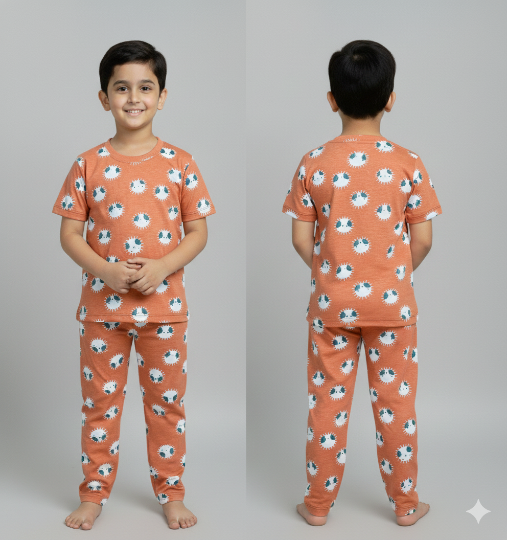 Let your little one sleep in comfort and style with this adorable Kids Printed Cotton Nightwear Set. Made from 100% soft cotton, this set is gentle on the skin and perfect for everyday wear or bedtime. The cheerful sun-inspired all-over print adds a fun touch, while the breathable fabric ensures all-night comfort. Designed for easy movement and a relaxed fit, this nightwear set is ideal for active kids and peaceful sleep.