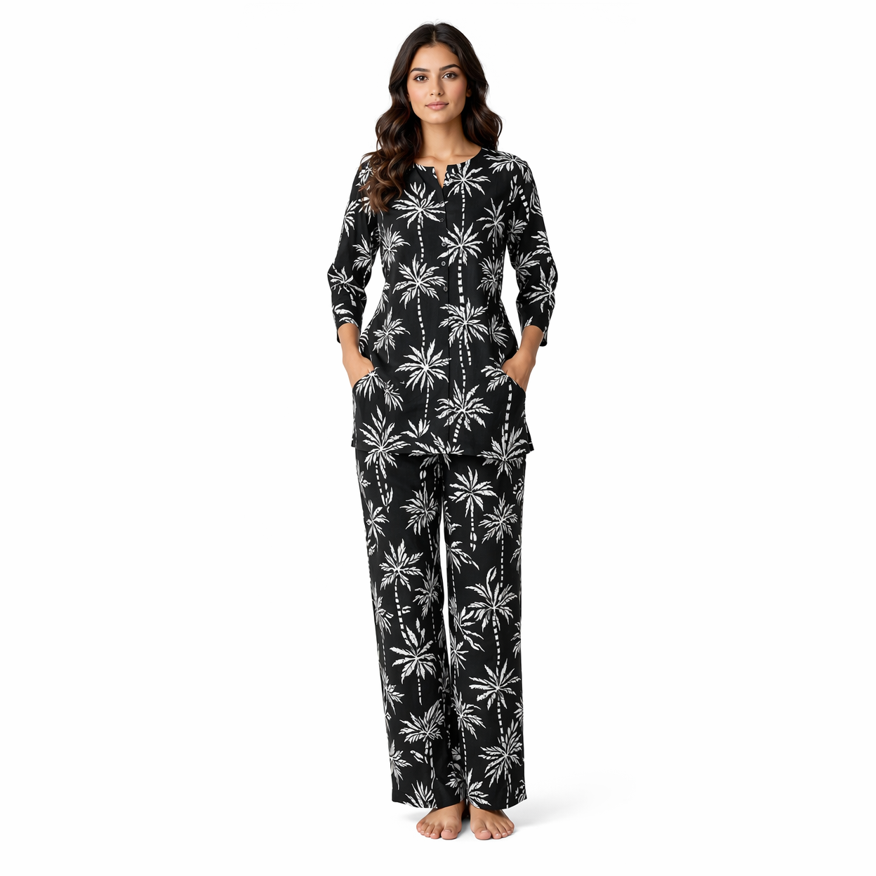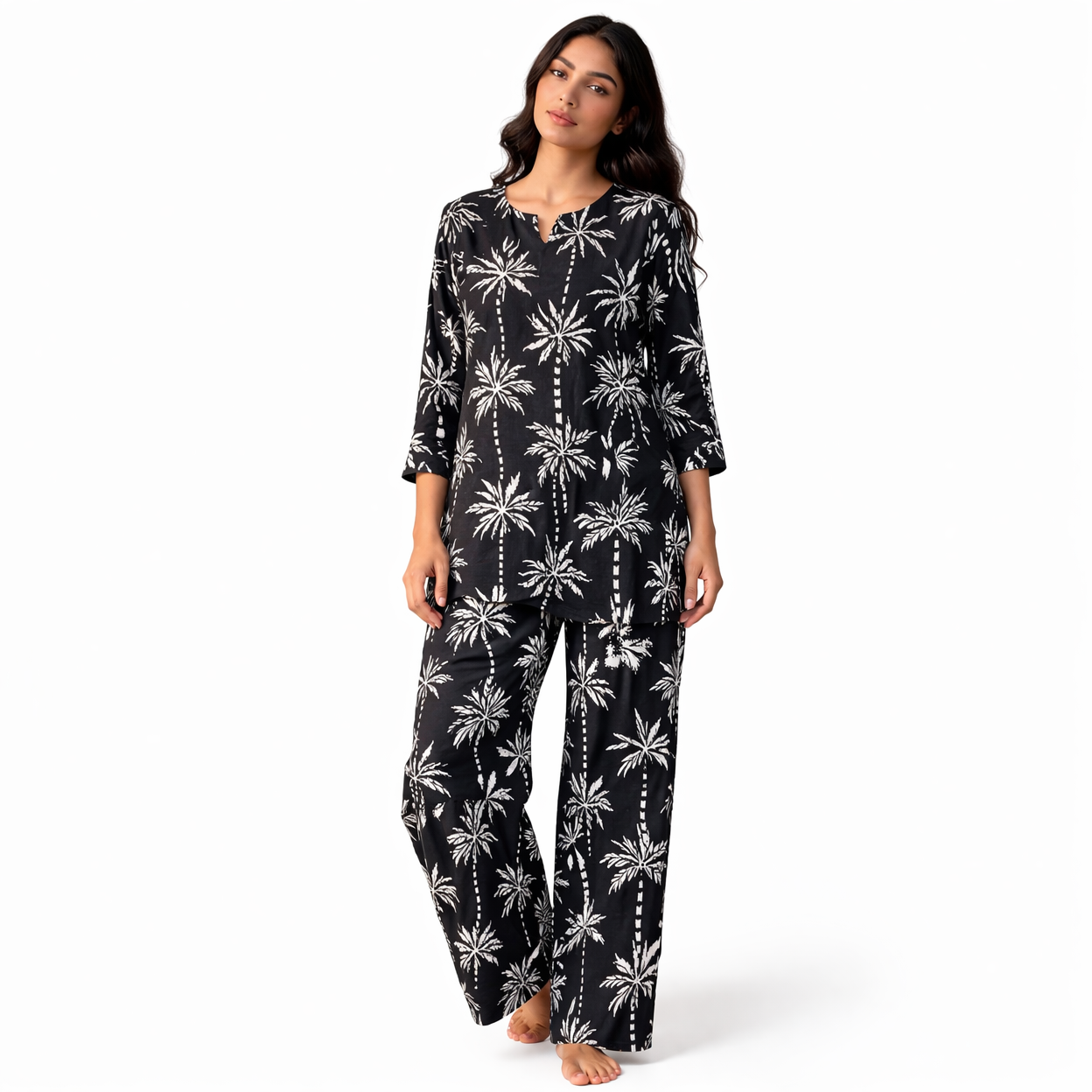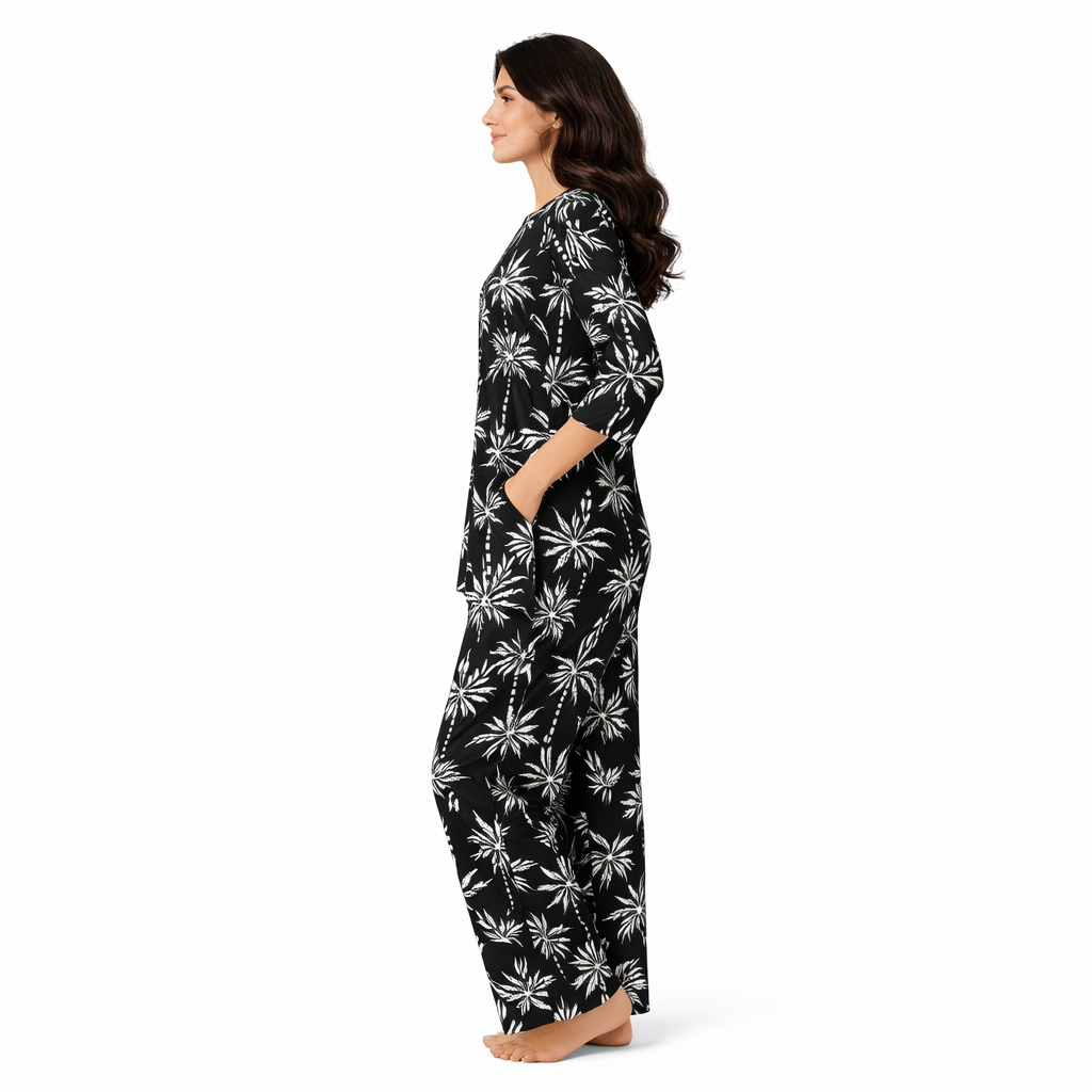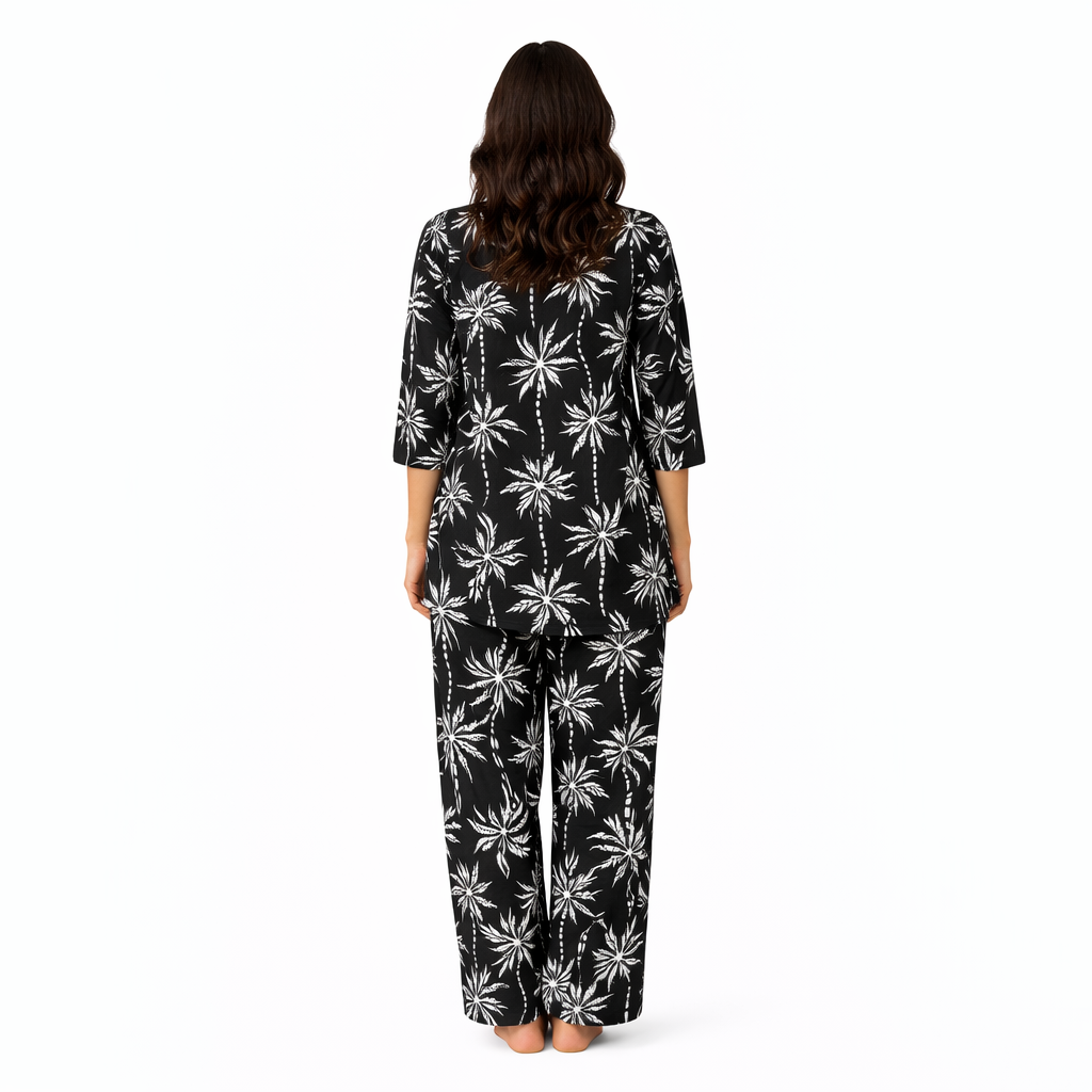 The striking white palm-inspired print on a rich black base adds a modern and chic touch, while the lightweight fabric ensures maximum comfort even in warm weather. The top is tailored with a comfortable neckline and easy fit, while the pants come with a relaxed silhouette for unrestricted movement.