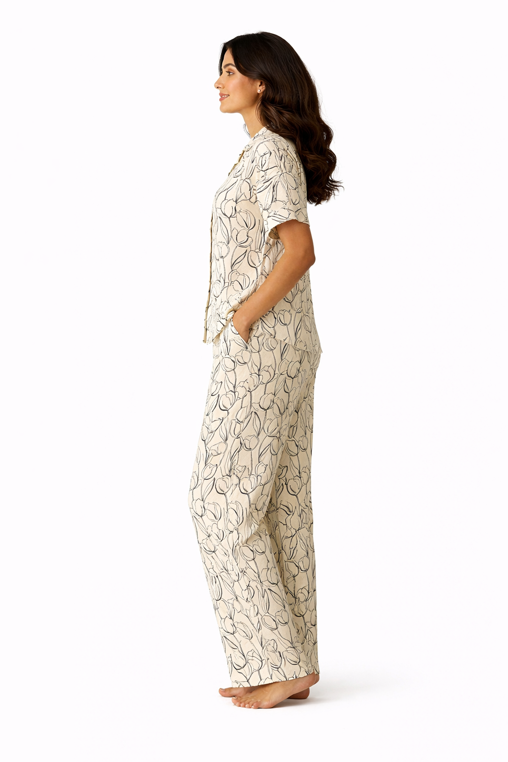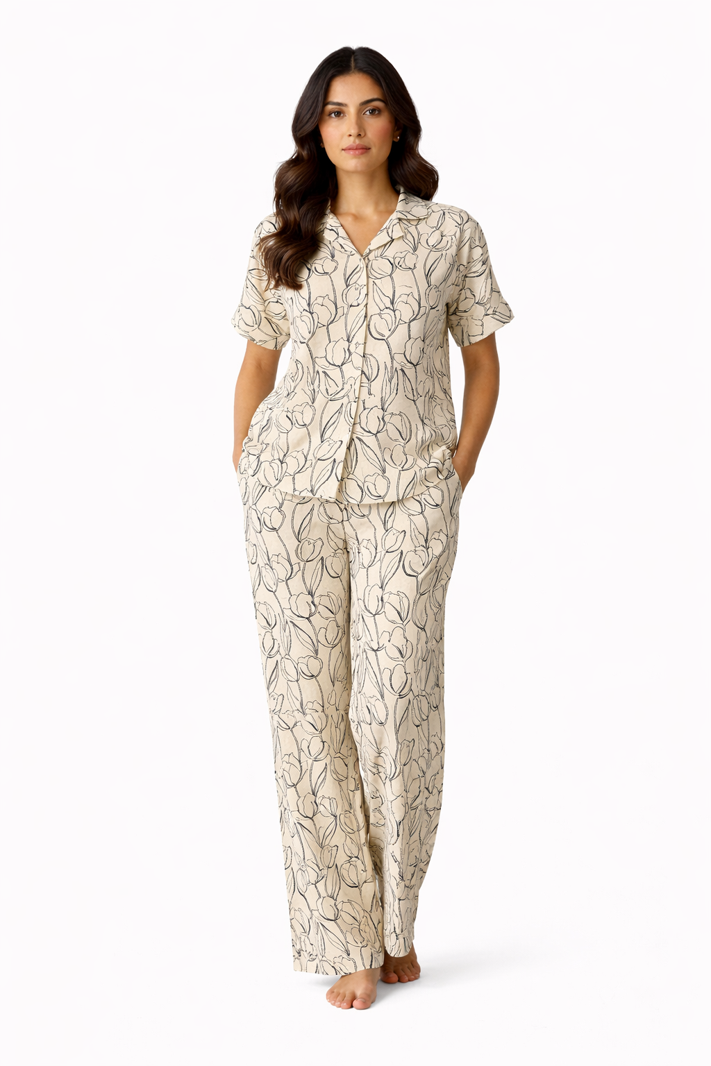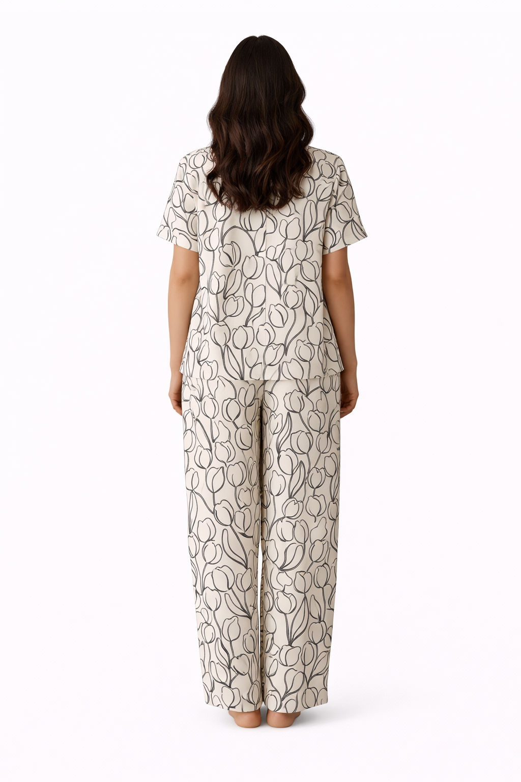 The soothing ivory base paired with a delicate tulip line print creates a minimal yet classy look, perfect for both lounging at home and casual outings. The relaxed silhouette ensures maximum comfort, while the lightweight fabric keeps you cool throughout the day.
