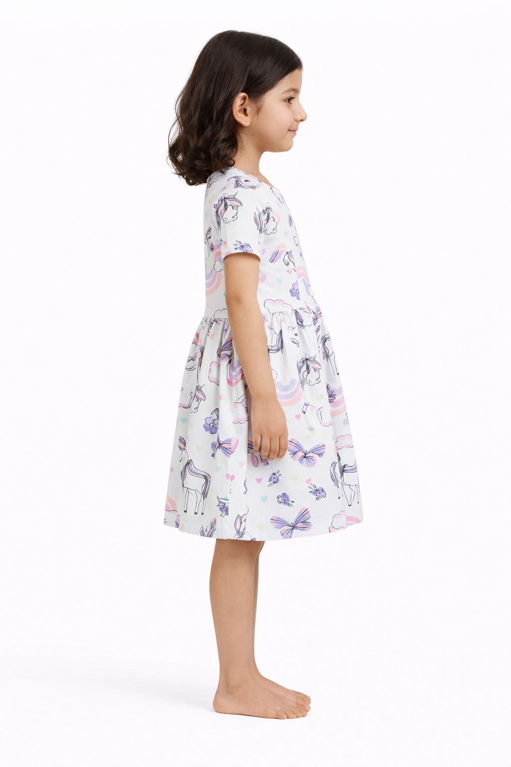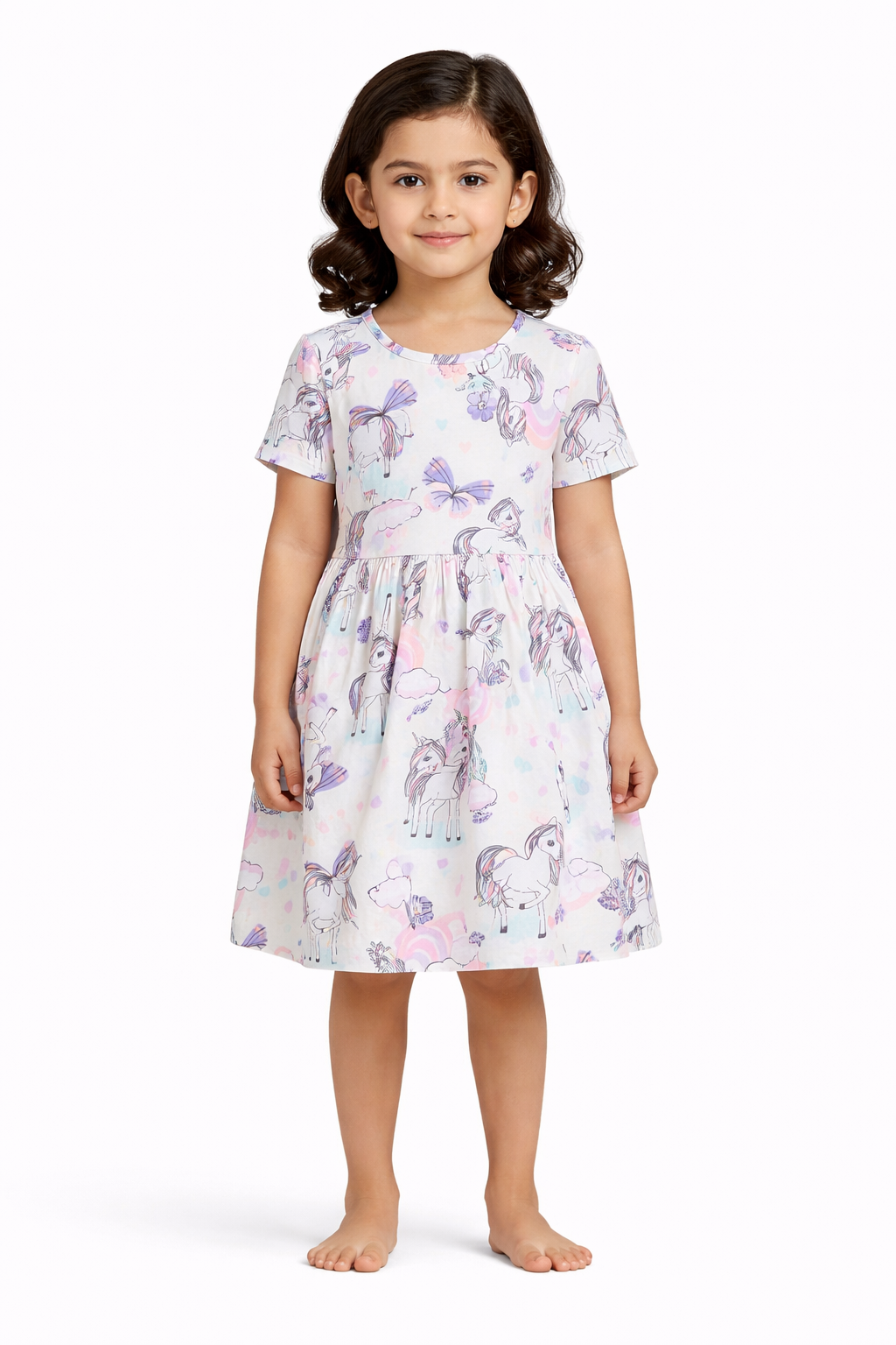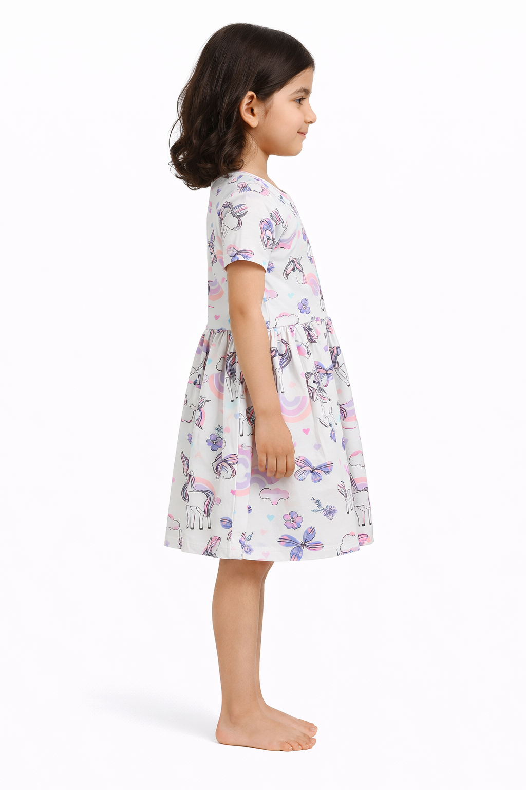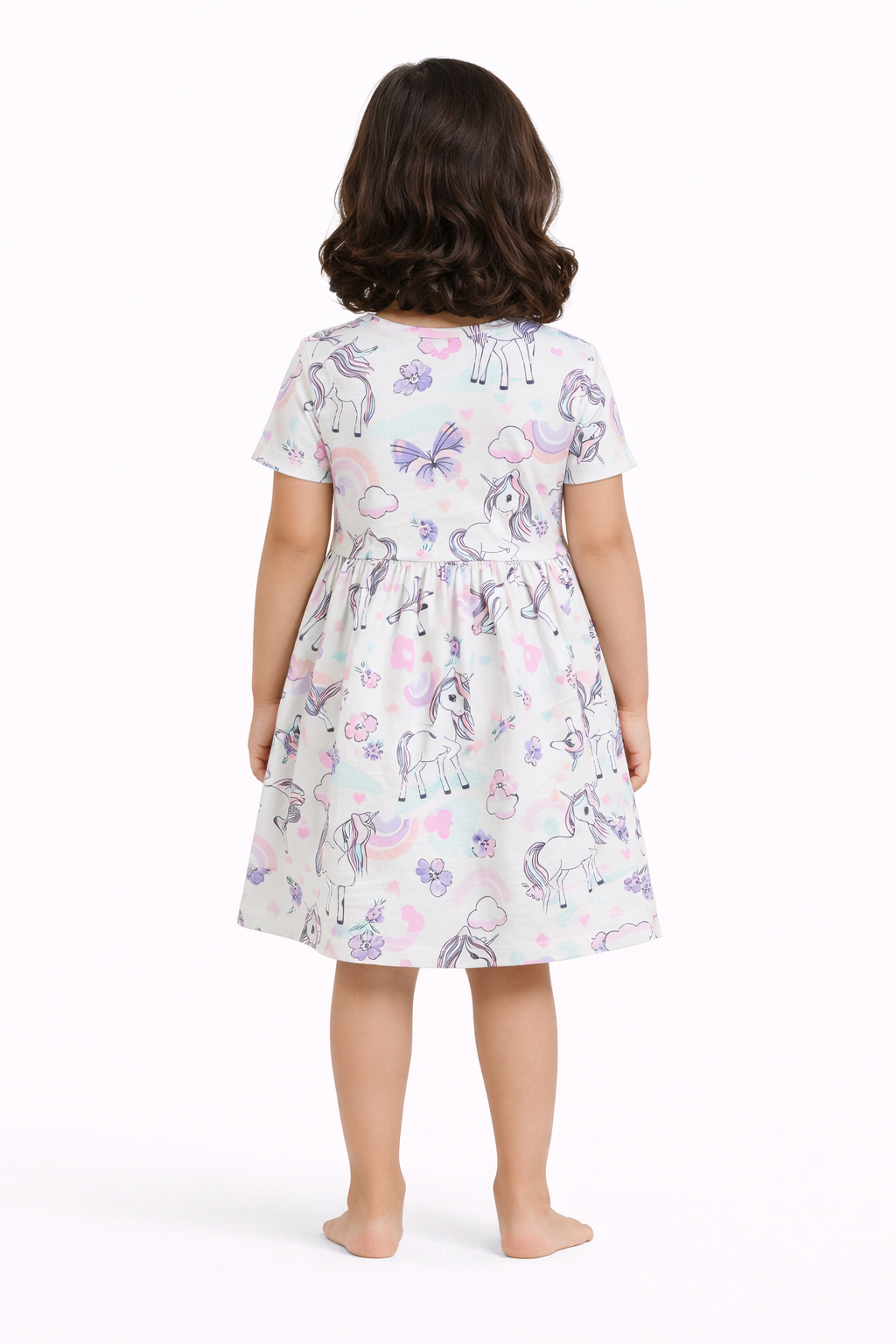 This premium kids dress is crafted from 100% Cotton Single Jersey (Single JC) fabric, ensuring superior softness, breathability, and all-day comfort for children. Designed with an attractive all-over unicorn print, the dress features vibrant yet soothing colors that enhance its stylish appeal.